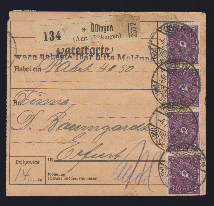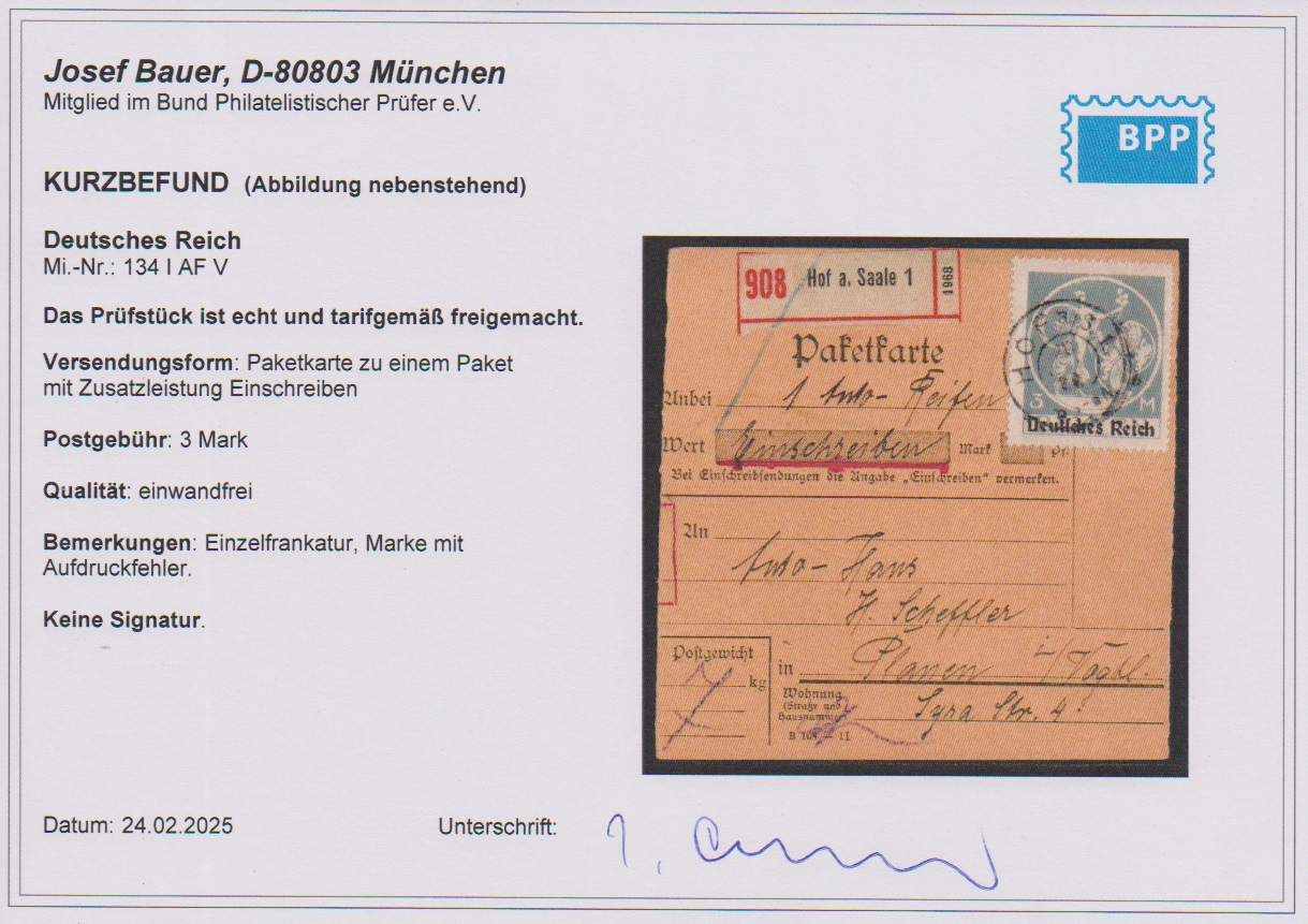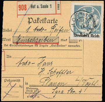 3 Mk. Bayern-Abschied in Type I mit Aufdruckfehler V als EF auf eingeschriebener Paketkarte (für "1 Auto-Reifen") aus Hof 1920. Fotoexp. Bauer