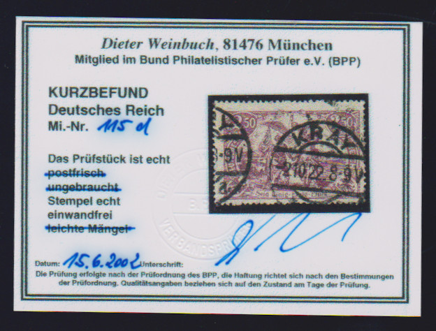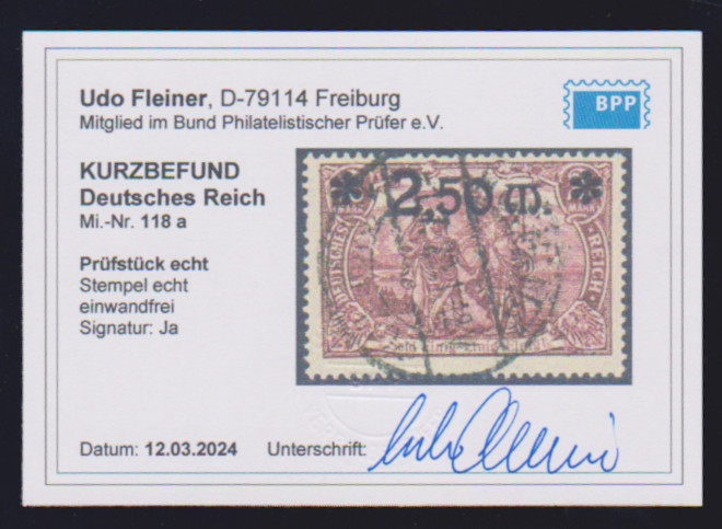 2,50 Mk. dunkelpurpur tadellos gest., Fotoexp. Weinbuch. Mi. 250,-