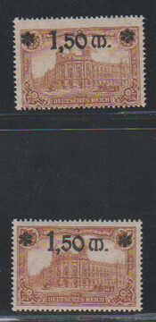 1,50 M. a. 1 Mk. postfrisch mit Aufdruckabart "1 mit breitem Kopf", dazu Normalmarke zum Vergleich. Mi. 220,-
