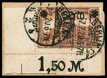 1,50 a. 1 Mk., linke untere Bogenecke (mit Randzudruck "1,50 M"), gute Randvariante "durchgezähnt", auf sauber gestempeltem Briefstück, sign. Infla. Mi. "-.-"