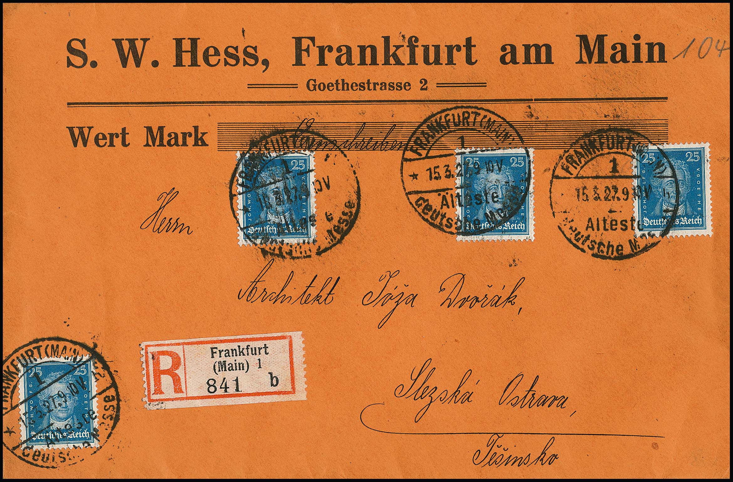 25 Pfg. Goethe per vier auf portoger. Auslands-R-Brief (61-80gr.) von Frankfurt