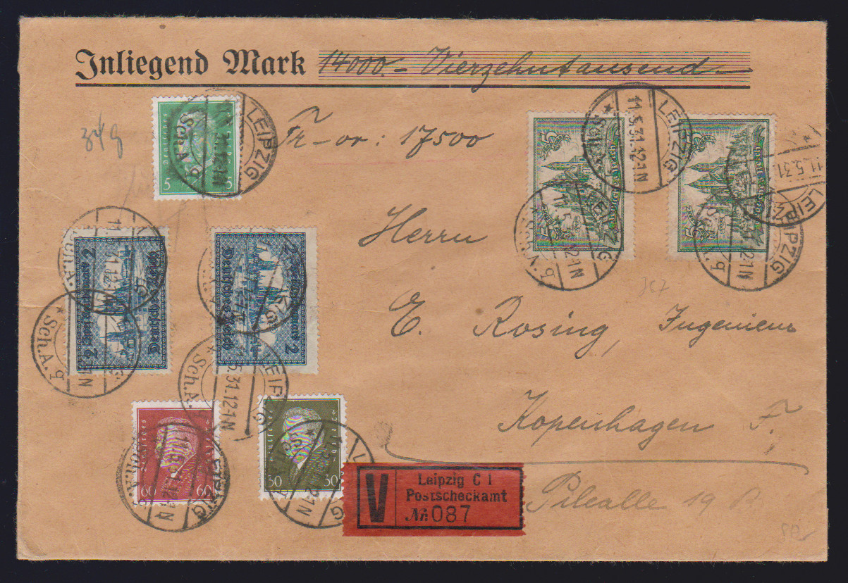 2 Mk. Alt-Köln und 5 Mk. Speyer je per zwei, nebst 5, 30 u. 60 Pfg. Hindenburg/Ebert, auf portoger. Auslands-Wertbrief des Postscheckamtes Leipzig