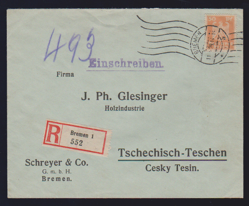 50 Pfg. Reichsadler als gute EF auf R-Brief zum Sonderporto von Bremen 1929 in die CSR