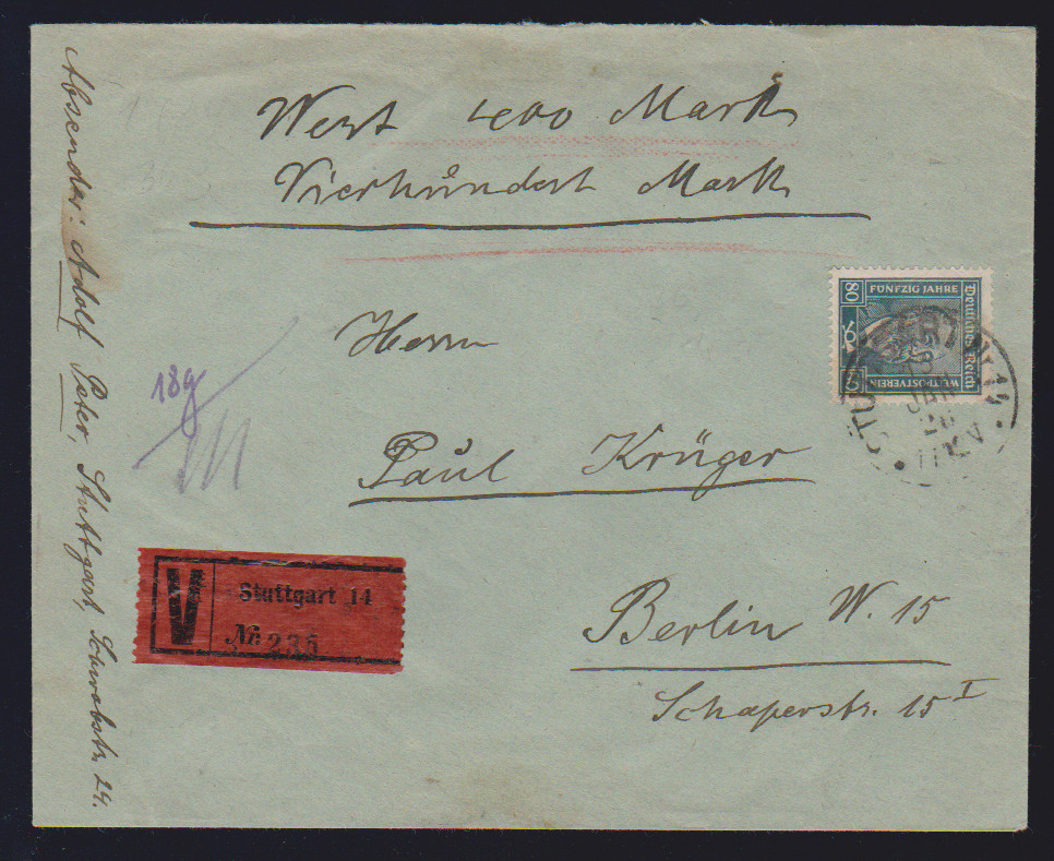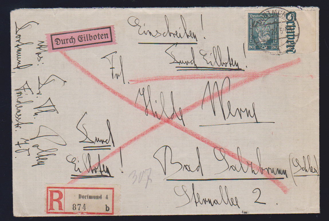 80 Pfg. Stephan, zwei verschiedene Einzelfrankaturen: auf Wertbrief und auf Eil-R-Doppelbrief