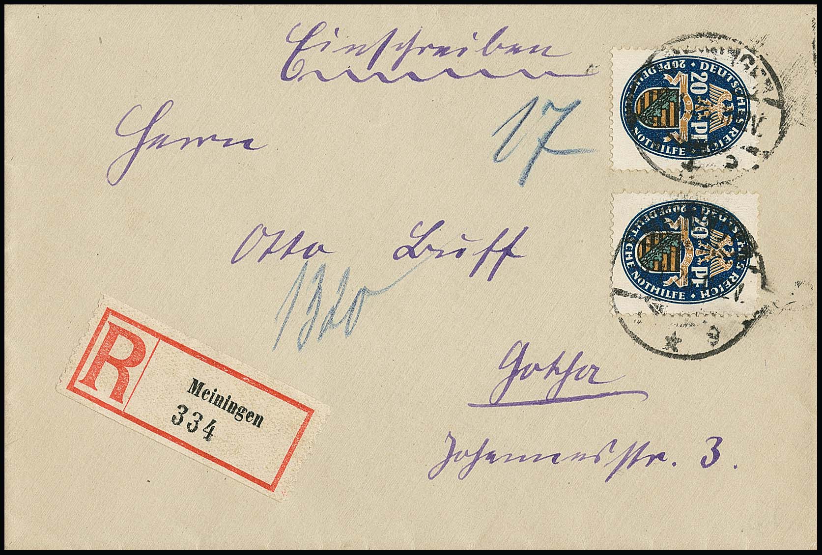 20 Pfg. Nothilfe per zwei als nicht häufige Mehrfach-Frankatur auf R-Brief aus Meiningen 1926