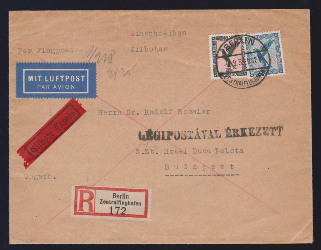 20 Pfg. und 1 Mk. Flugpost auf Lupo-Auslands-Eil-R-Brief von Berlin 1933 nach Budapest