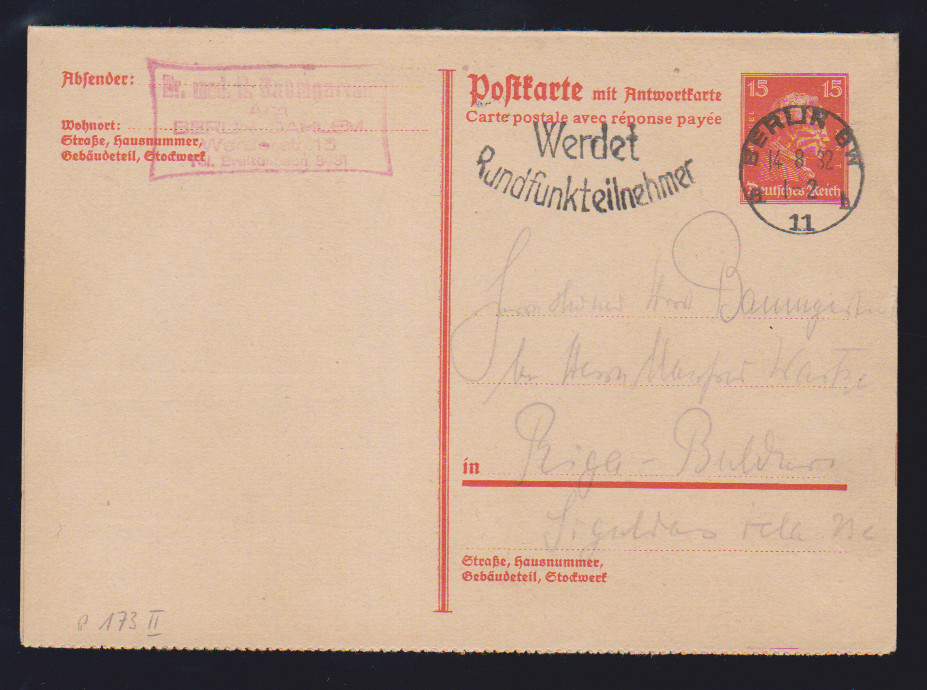 Ganzsachen-Doppelkarte 15 Pfg. Kant in guter Type II gelaufen 1932 von Berlin nach Riga, Antwortteil ungebraucht, Mi. 225,-
