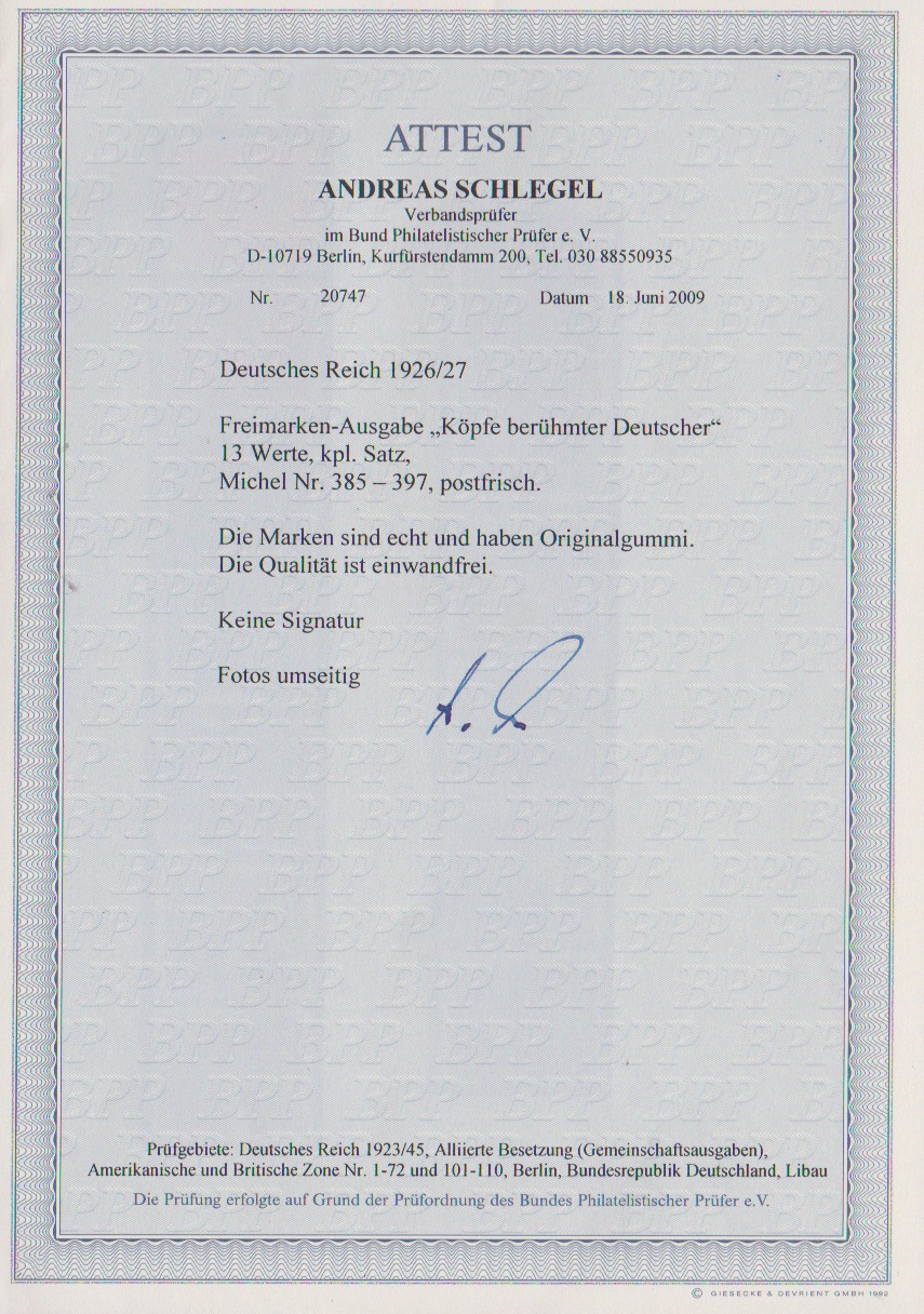 Berühmte Deutsche postfrisch, Attest A. Schlegel. Mi. 1300,-