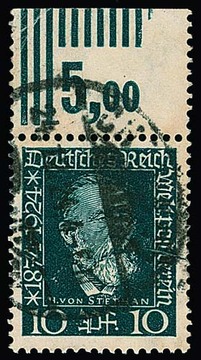 10 Pfg. Stephan, gestempeltes Walzendruck-Oberrandstück mit teils fehlenden Walzendruckstrichen oben, siehe Foto