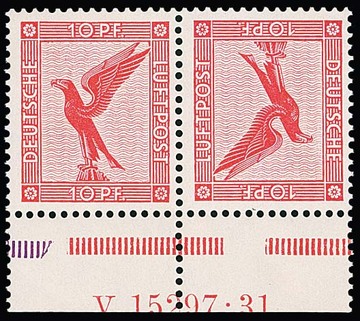 10 Pfg. Flugpost, postfrischer Kehr-Zusammendruck vom Rand mit HAN "V 15297.31", leichte herstellungsbedingte Gummibüge, Mi. 1000,-