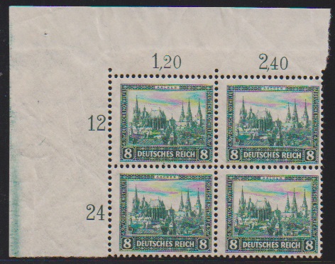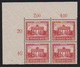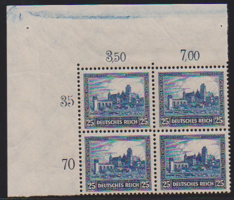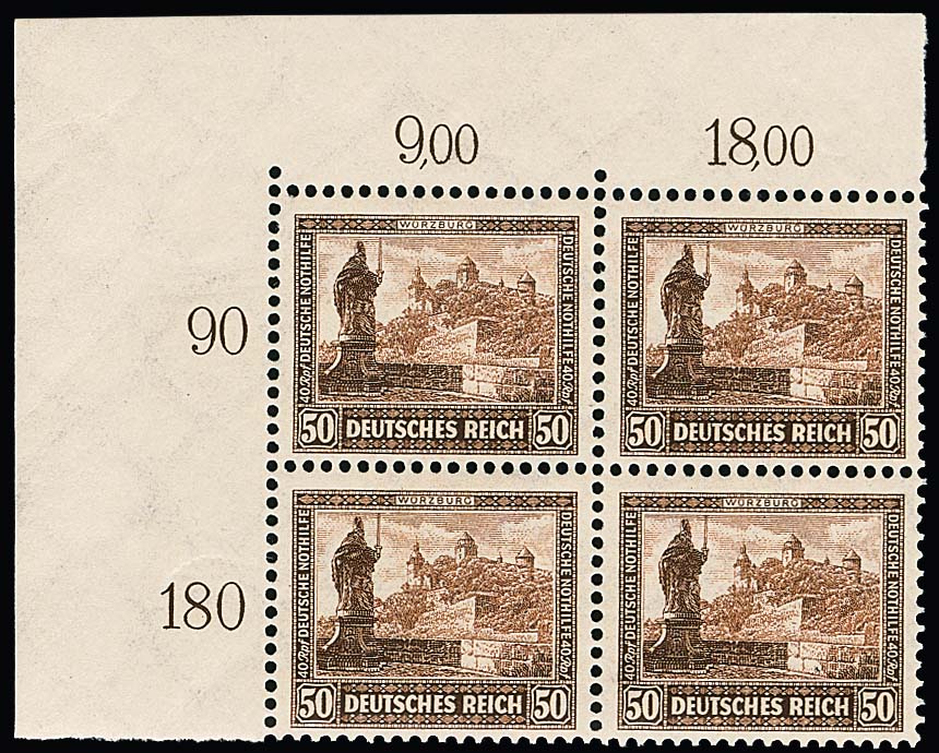Nothilfe einheitlich in postfrischen Viererblöcken aus der linken oberen Bogenecke, bei der 25 Pfg. ein Wert typischer Gummibug herstellungsbedingt. Mi. 600,- +