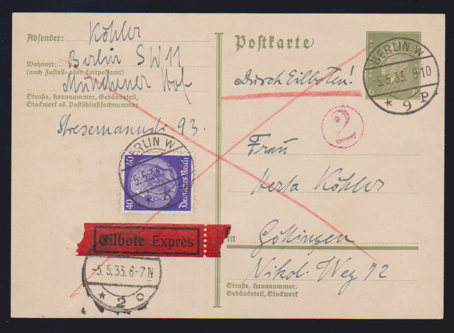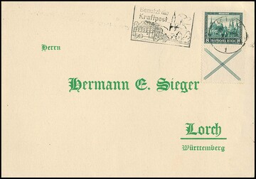 8 Pfg. Nothilfe, senkrechter Andreaskreuz-Zusammendruck auf portoger. Postkarte, Mi. 300,-