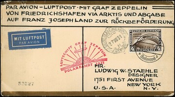 4 RM Polarfahrt auf kalligraphisch schön adressiertem Zeppelinbrief, Polarfahrt ab Friedrichshafen bis Malygin. Mi. 1100,- + Sieger Nr. 119H (375,-), leichte Gebrauchsspuren