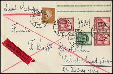 15 Pfg. Nothilfe, senkrechter Zwischensteg-Zusammendruck mit linkem Strichelleistenrand, nebst Zusammendruck 15 u. 8 Pfg., sowie 3 Pfg. Ebert, auf praktisch portogerechtem Expreßbrief von Dessau 1931 nach Schallstadt (um 1 Pfg. überfrankiert, was nicht anders ging, da es keine 2-Pfg.-Marke gab). Mi. 1360,-, Couvert winziger Randriß
