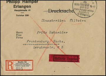 IPOSTA-Block rs. auf gelaufenem R-Brief von der IPOSTA mit entspr. SST, 16.9.1930, nach Frankenberg/Sachsen. Mi. lose gest. 2000,-