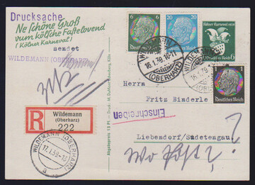 Drei Ganzsachenkarten mit ZuF in besserer Verwendung: P199I mit Nr. 472 als Eilkarte, P252 mit Nr. 414, 540, 549 und Dienst Nr. 131 u. 135 als Orts-Eilkarte vom Letzttag, sowie P276 mit Nr. 512, 516 u. 521 als R-Drucksache