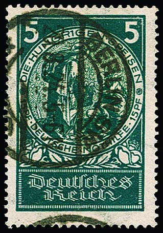 5 + 15 Pfg. Nothilfe mit Plattenfehler "HUNGR1GEN" ("1 statt I") tadellos und klar gestempelt. Es handelt sich um einen der seltensten Plattenfehler des Deutschen Reiches überhaupt, nur wenige Exemplare bekannt. Sign. G. Schlegel und Attest A. Schlegel. Mi. 3800,-