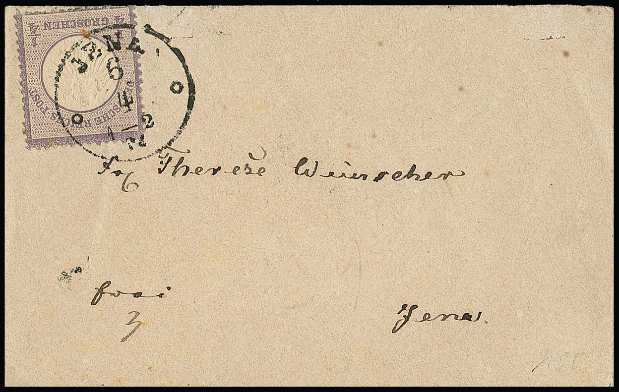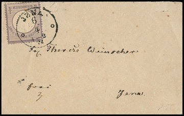 1/4 Gr. grauviolett (unten links zwei kurze Zähnchen durch Randklebung) einzeln auf hübschem Ortscouvert aus Jena