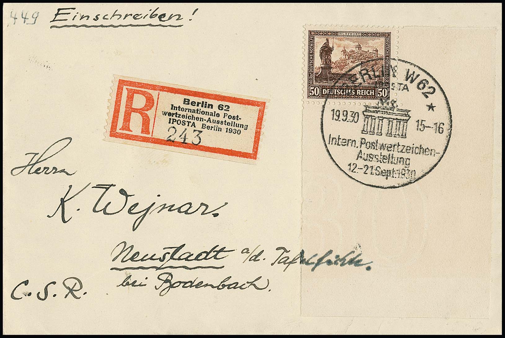 50 Pfg. Nothilfe, komplette rechte untere Ecke aus IPOSTA-Block als sehr seltene portogerechte Einzelfrankatur auf Auslands-R-Brief zum Sondertarif von Berlin, von der IPOSTA in die CSR