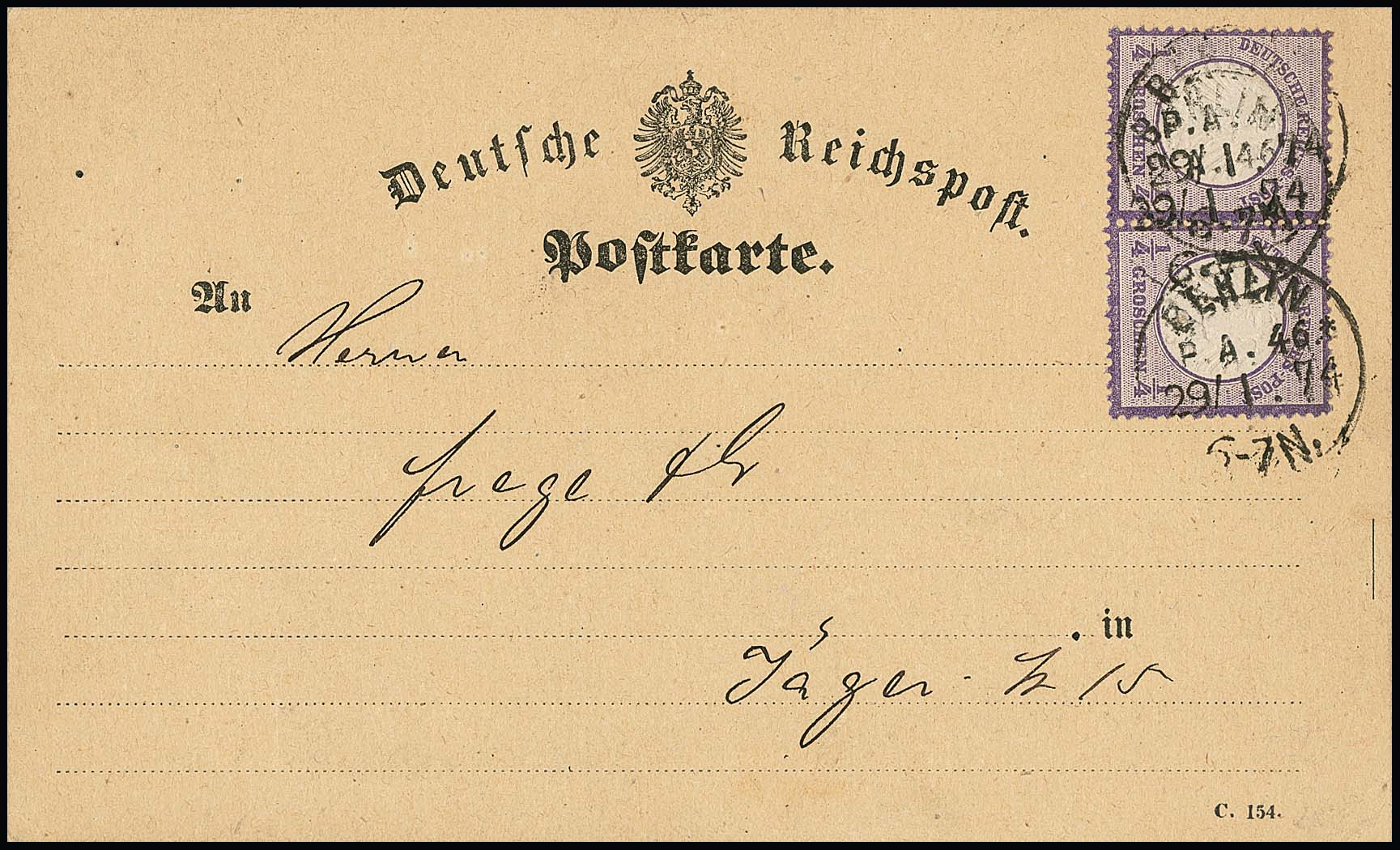 1/4 Gr. grauviolett im Paar auf Kabinett-Ortspostkarte mit K1 "Berlin P.A. 46", Fotoexp. Krug