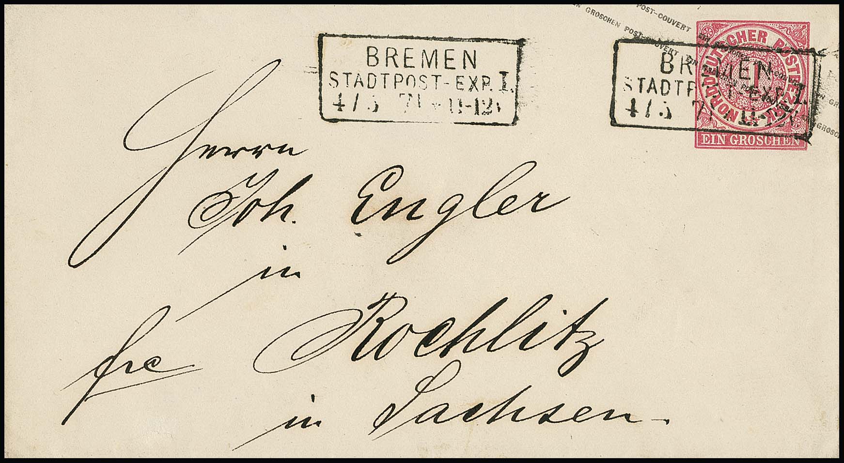 NDP-Ganzsache 1 Gr. karmin, Kabinettcouvert mit Ra3 "BREMEN STADTPOST-EXP. I. 4.5.71" (Ersttag der Reichspost)