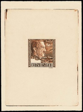 Die letzte Marke des III. Reiches: Entwurf zu einer sog. "Siegesmarke" mit Abbildung von Hitler neben einer JU 87, einem Panzerkreuzer und einem Panzer, die zur Ausgabe nach dem Endsieg und nach den NSFK-/NSKK-Marken geplant war, aber nicht mehr realisiert wurde, hier als brauner Einzelabzug ohne Wertangabe. Vom Stecher Milo Bernas gestalteter Einzelabzug im Stichtiefdruck, hergestellt für die Wiener Staatsdruckerei und in den dortigen Archiv-Unterlagen als "Siegesmarke" archiviert. Es handelt sich nach dem in unserer 230. Auktion 2025 versteigerten Exemplar um das zweite bekannte Vorlagestück der "Siegesmarke" und um ein Unikat, zuletzt angeboten 5. Öphila-Auktion 1989. Attest Soecknick