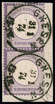1/4 Gr. grauviolett im Paar auf Kabinettbriefstück mit K1 "Gnesen", Mi. 320,- +