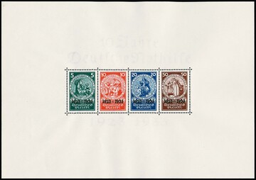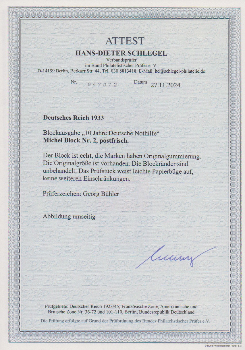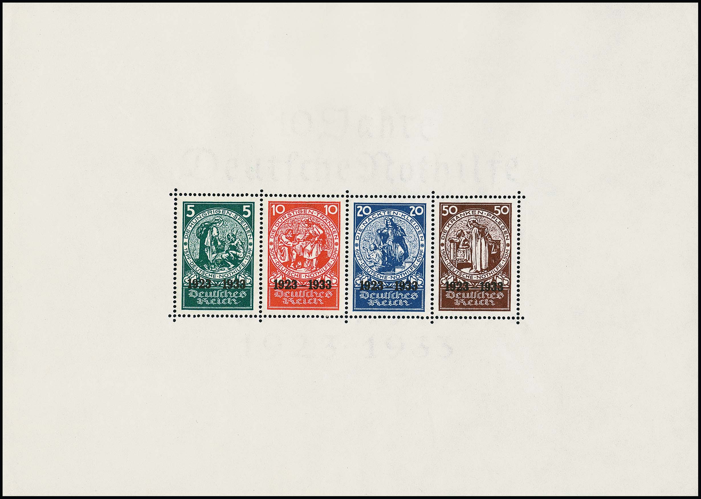 Nothilfe-Block postfrisch, am Rand unten ein winziger punktgroßer Fleck (ca. 0,4 x 0,4mm), den ich tatsächlich für völlig belanglos halte, wie auch die persönliche Betrachtung des Käufers zeigen wird. Mi. 6000,-, Attest Schlegel