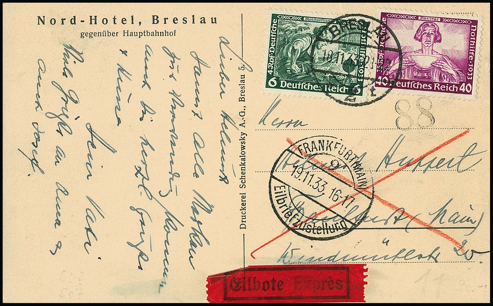 6 und 40 Pfg. Wagner auf portoger. Expreß-Postkarte von Breslau 1933 nach Frankfurt
