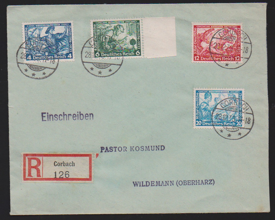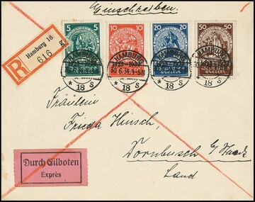 Nothilfe-Block-Einzelmarken (5 Pfg. oben leicht getönte Zahnspitzen) auf unterfrankiertem Land-Expreß-R-Brief von Hamburg 1934 nach Dornbusch bei Stade, dennoch ohne Nachtaxen. Mi. lose gest. 2000,-