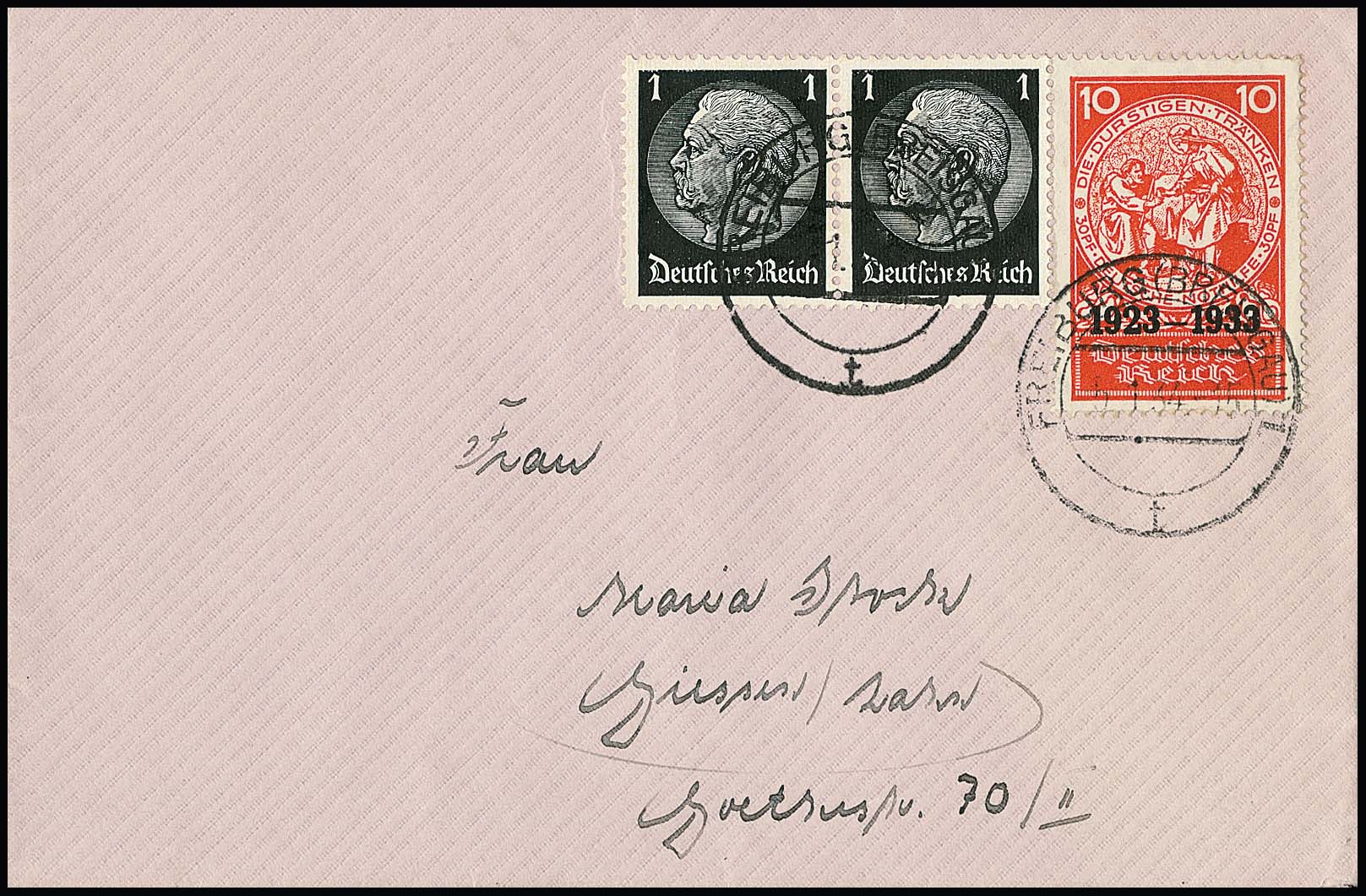 10 Pfg. aus Nothilfe-Block, nebst Paar 1 Pfg. Hindenburg, auf portoger. Brief aus Freiburg, Mi. 800,-