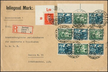 Wagner-Zusammendrucke 6/4/6 und zweimal 4/6/4 Pfg., nebst linker oberer Bogenecke 10 Pfg. Ebert, auf Bedarfs-Einschreibebrief aus Saalfeld