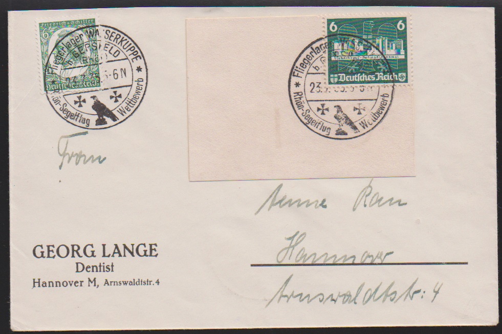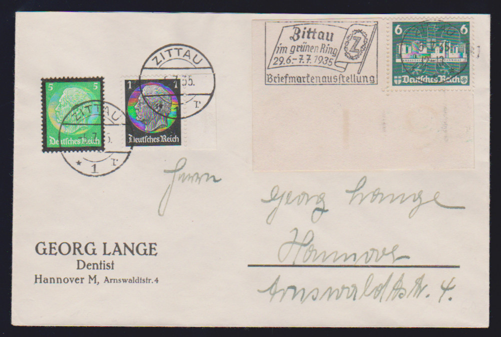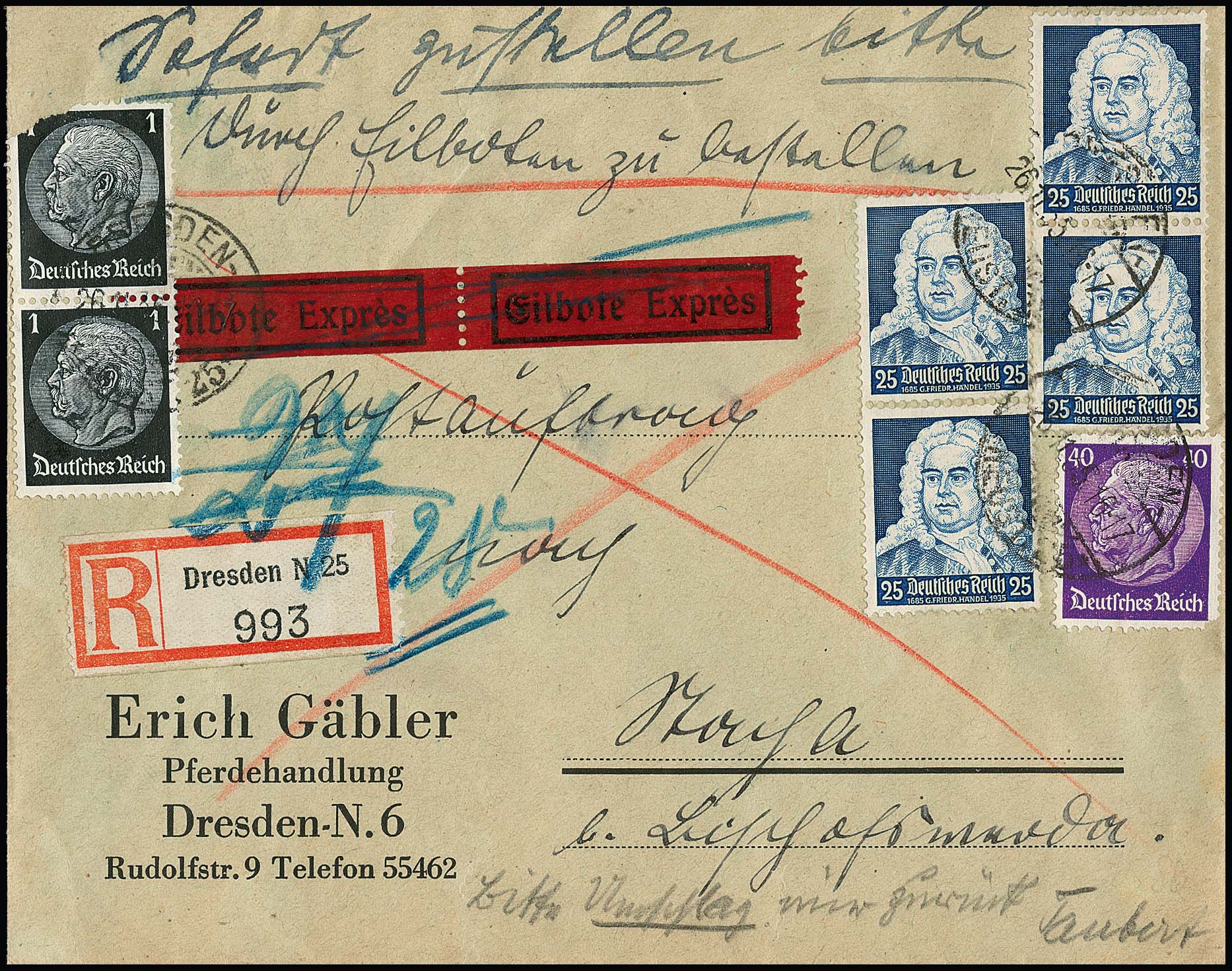 25 Pfg. Bach per vier, nebst Paar Hindenburg 1 Pfg. und 40 Pfg. (diese Randmgl.) auf seltenem Land-Expreß-R-Postauftrag von Dresden 1935 in den Landbezirk von Bischofswerda (Rate 142 Pfg.)
