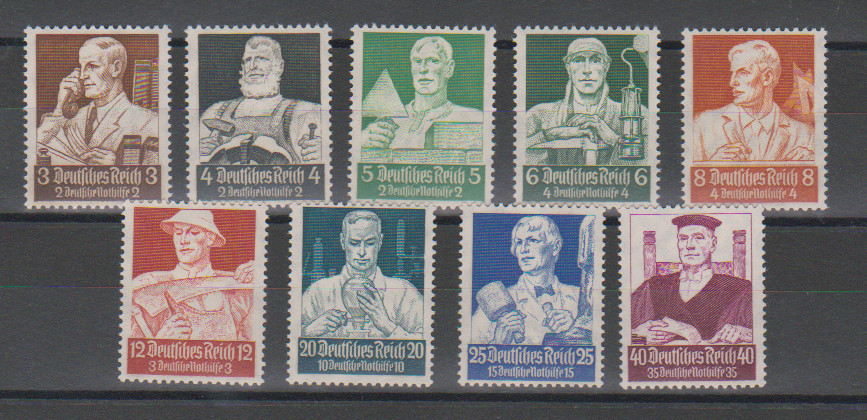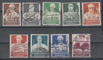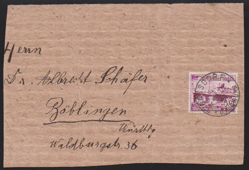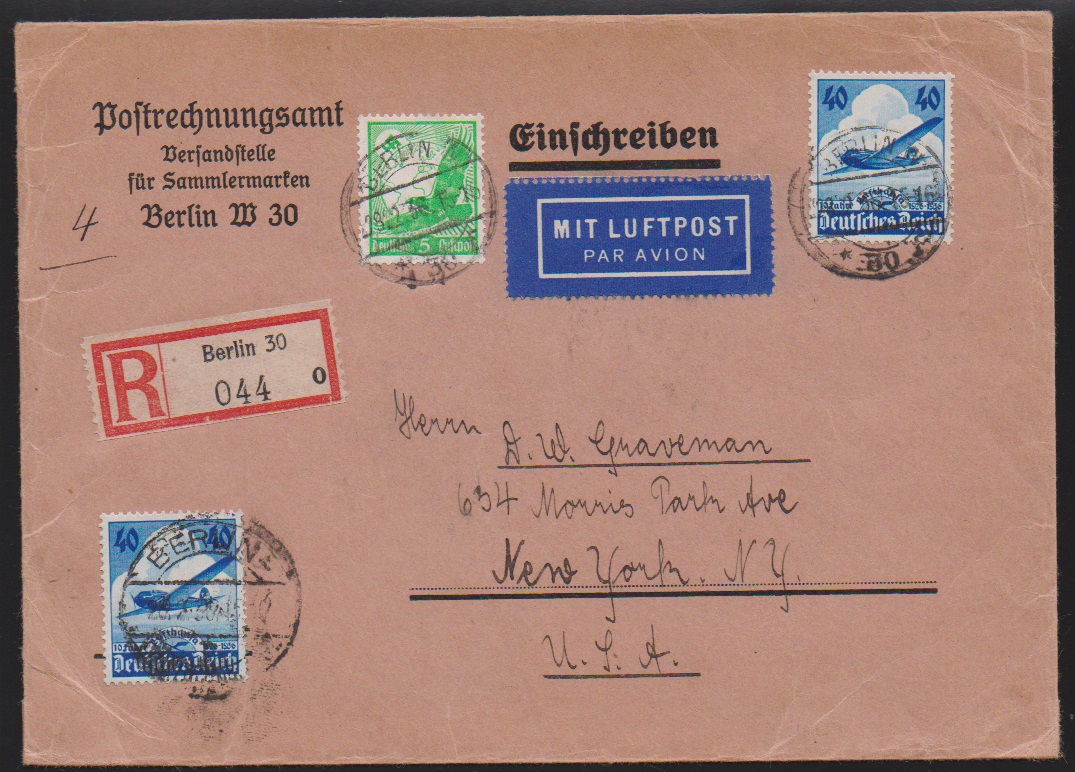 Sieben gute Sondermarken-Frankaturen III. Reich: Nr. 614 als EF auf Auslandskarte, Nr. 618-20 auf R-Brief, gute EF Nr. 659 (40 Pfg. WHW) auf Päckchen-Adresse, Bogeneckenpaar Nr. 672x als MeF, 692 im Bogenecken-VB als MeF, NN-R-Brief mit Nr. 721(2), 723 u. 725, sowie Nr. 758 vom Unterrand auf Auslands-Zensur-Brief