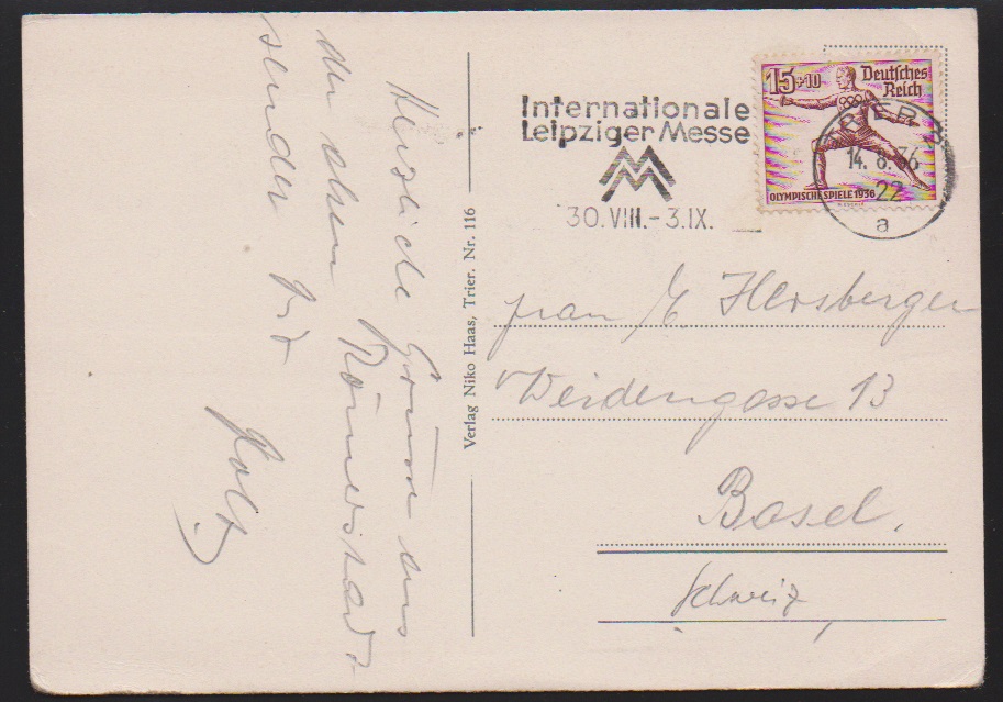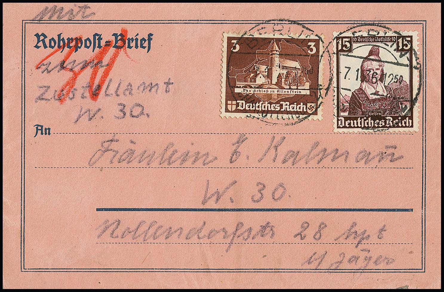 3 Pfg. aus Ostropa-Block, nebst 15 Pfg. Trachten, auf Rohrpost-Ortsbrief aus Berlin 1936