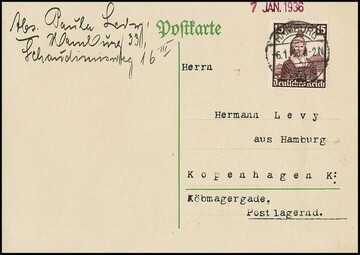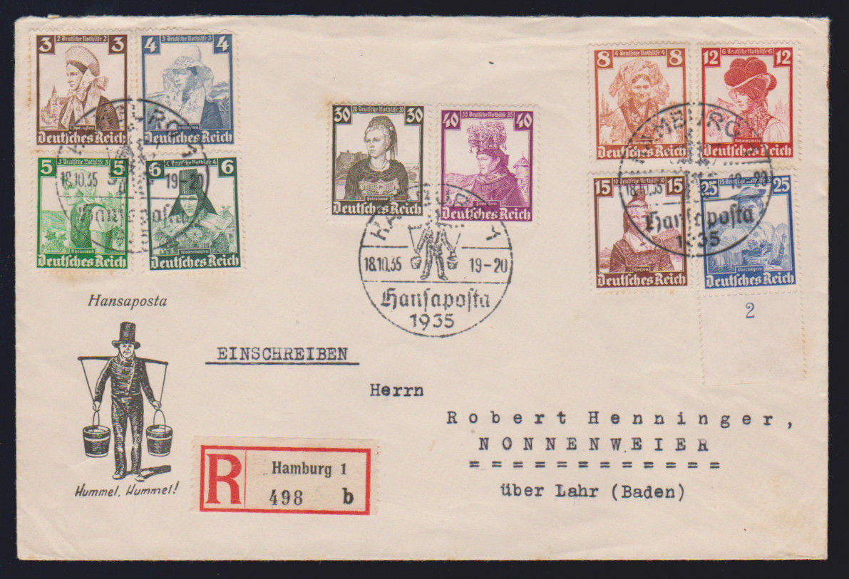 15 Pfg. Trachten, gute EF auf Auslands-Postkarte von Hamburg nach Kopenhagen, sowie in MiF nebst 25 Pfg. Trachten und 10 Pfg. Flugpost auf Auslands-R-Brief zum Sonderporto 1936 nach Ungarn