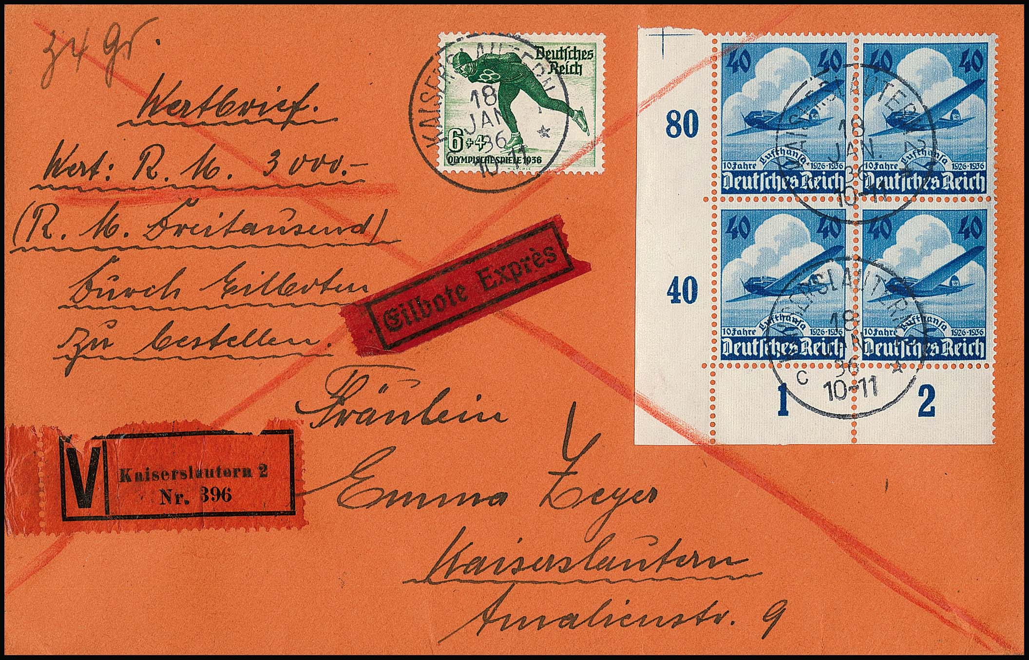 40 Pfg. Lufthansa im Viererblock aus der linken unteren Bogenecke, nebst 6 Pfg. Winterolympiade auf Orts-Expreß-Doppel-Wertbrief aus Kaiserslautern, sowie per zwei nebst 5 Pfg. Luftpost auf Überseebrief