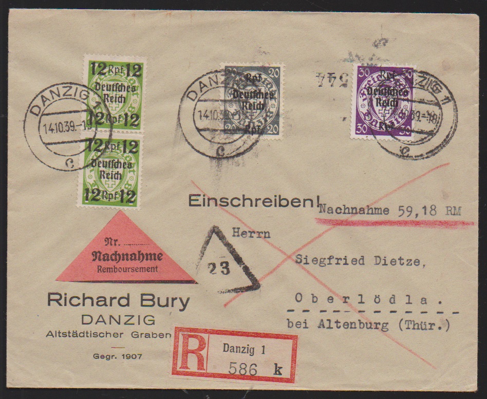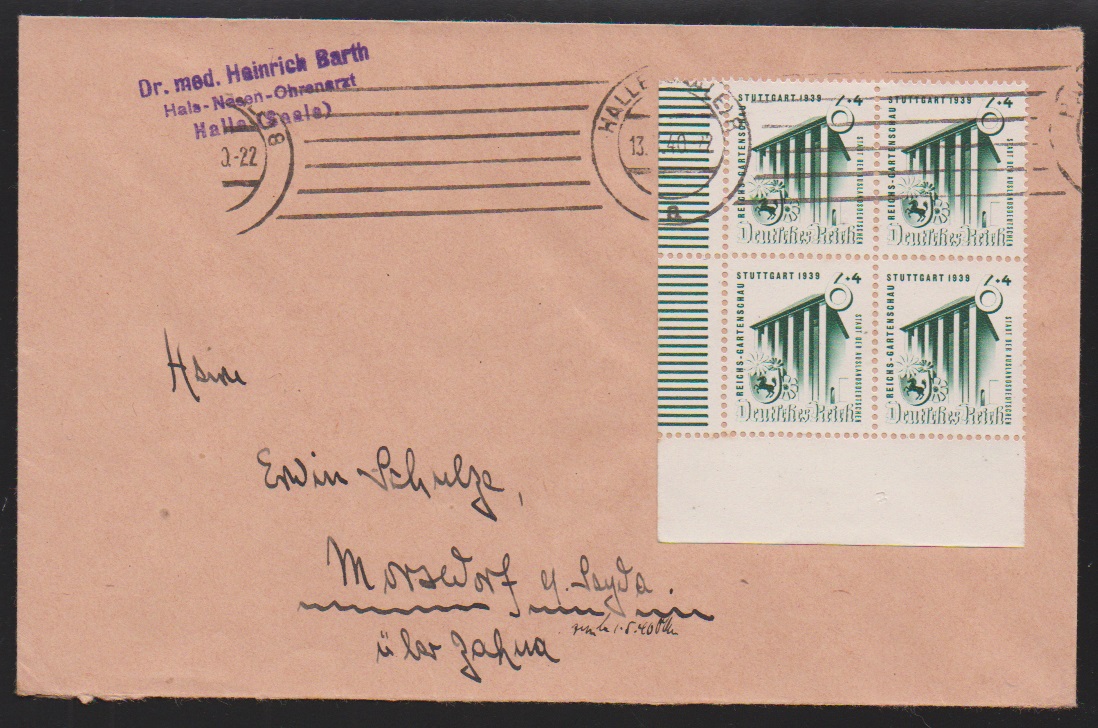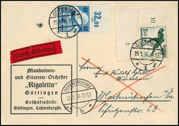 3 und 25 Pfg. (diese mit vollem Blockrand) aus Ostropa-Block, nebst ZuF, auf portoger. R-Brief, ferner 6 Pfg. aus Ostropa-Block mit kpl. Rand, nebst 6 Pfg. Schiller, auf portoger. Brief, Mi. über 300,-