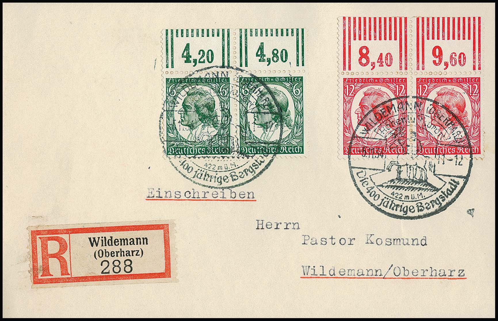 Schiller kpl. in waager. Oberrandpaaren auf Reco-Blanko-Ersttagskarte, "Wildemann", 5.11.34, Mi. 800,-