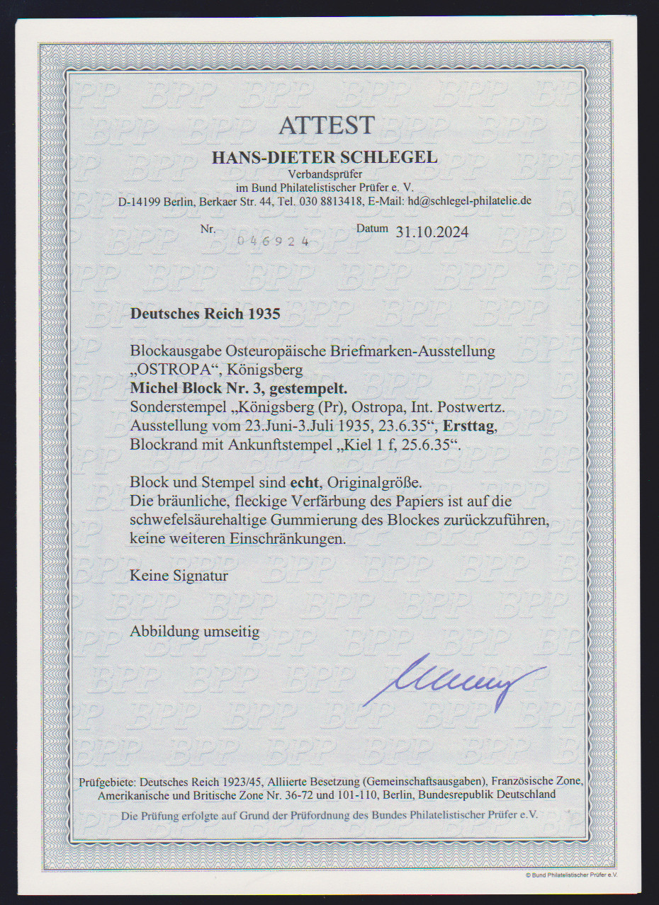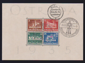 Ostropa-Block mit Ersttagsstempel in optisch guter Erhaltung (rs. leichte Spuren der schwefelhaltigen Gummierung sichtbar). Mi. 1100,- + ESST, Attest D. Schlegel