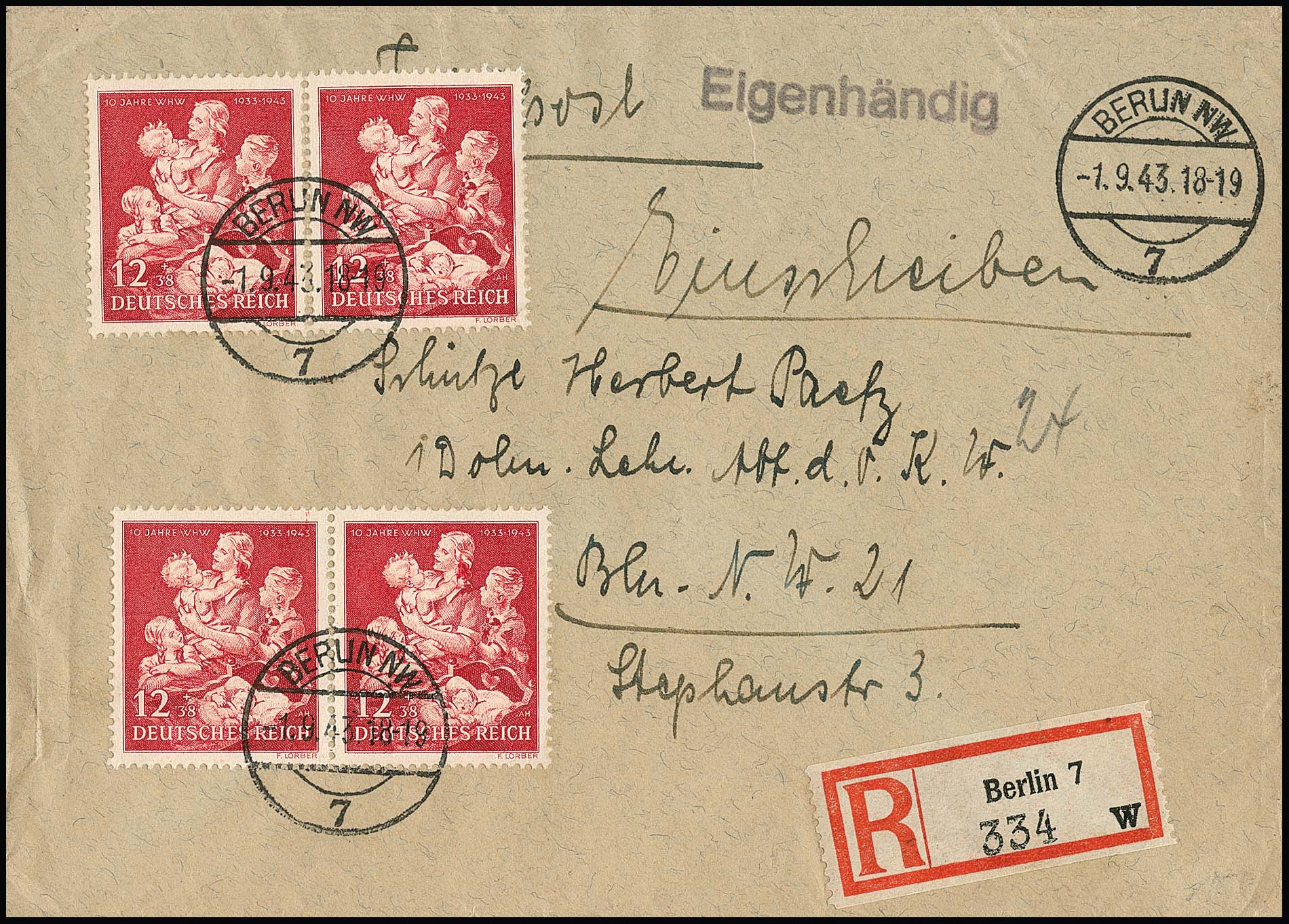 12 + 38 Pfg. WHW per vier auf FDC, Orts-R-Brief "Eigenhändig"