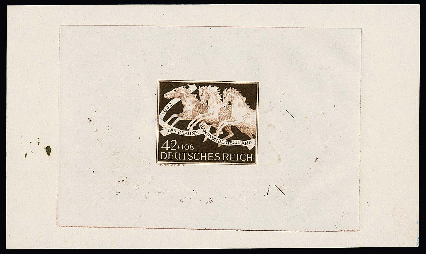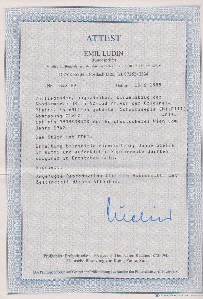 42 + 108 Pfg. Braunes Band, geschnittener Probe-Einzelabzug mit rückseitig dünner Stelle von Anhaftung auf Vorlagekarton, Attest Ludin
