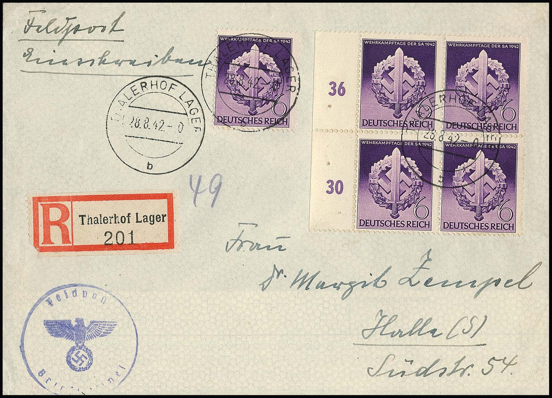 6 Pfg. Wehrkampftage, zwei gute Mehrfach-Frankaturen: per sieben auf R-Brief, sowie per fünf auf Feldpost-R-Brief (R-Zettel "Thalerhof Lager"), hier nur die R-Gebühr frankiert