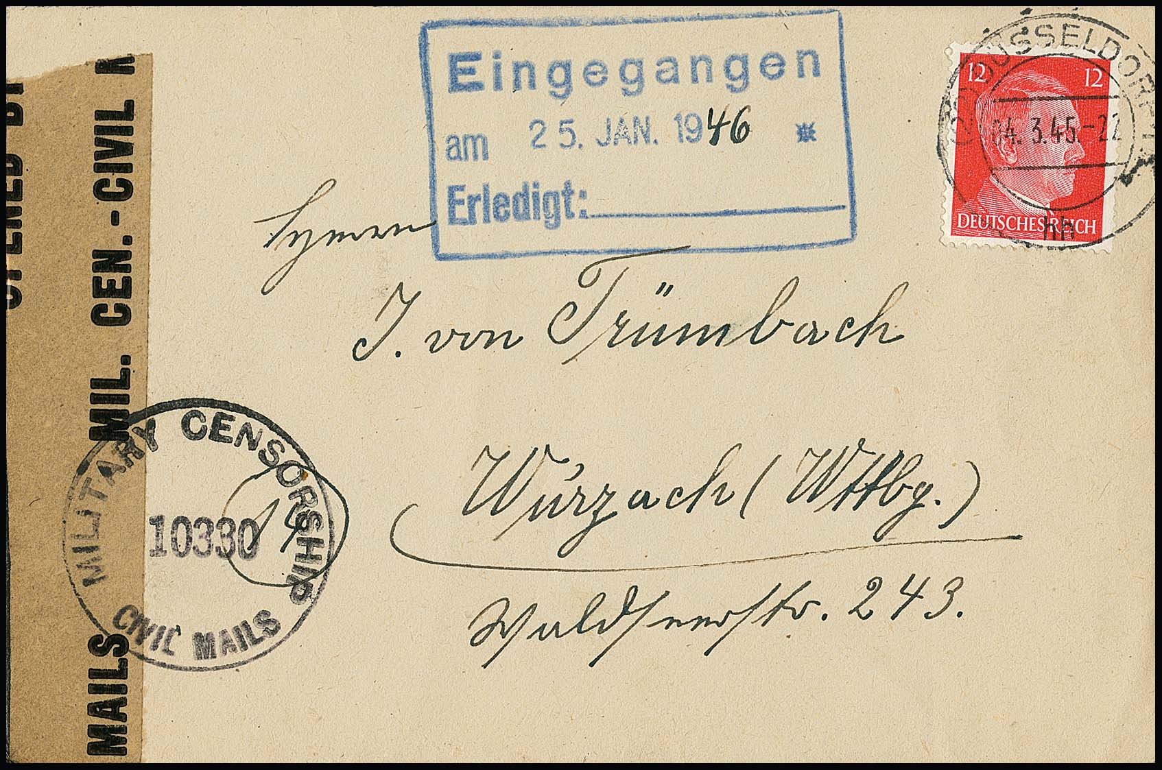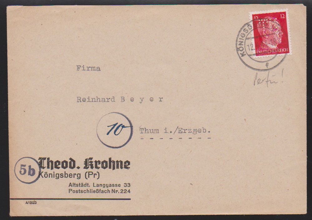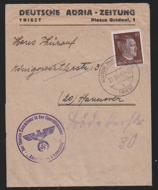 10 Pfg. Hitler ("eckrund") als EF auf Streifband der "Adria-Zeitung" mit Stempel "Deutsche Dienstpost Triest" 1944, sowie 12 Pfg. auf Überrollerbrief aus Düsseldorf, 4.3.1945, mit Zensur nach Württemberg und erst am 25.1.46 zugestellt (!), ferner auf Brief mit Firmenlochung "T.K." aus Königsberg