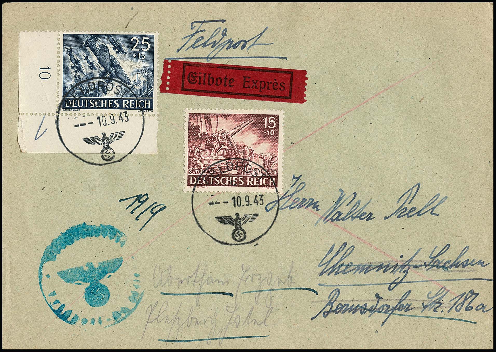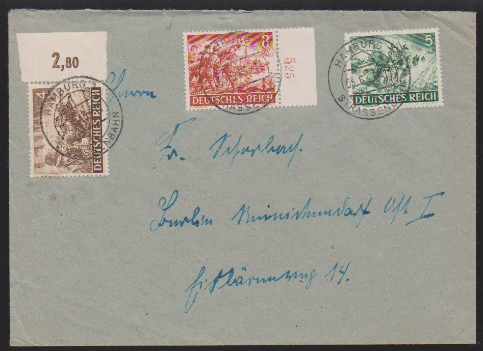 Wehrmacht, zwei bessere Belege: 4, 5 und 8 Pfg. auf Brief 1943 mit seltenem Stempel "Hamburg Strassenbahn" nach Berlin, sowie 15 und 25 Pfg. (Bogenecke) als Expreßgebühr auf an sich portofreiem Feldpost-Expreßbrief 1943 mit Weitersendung