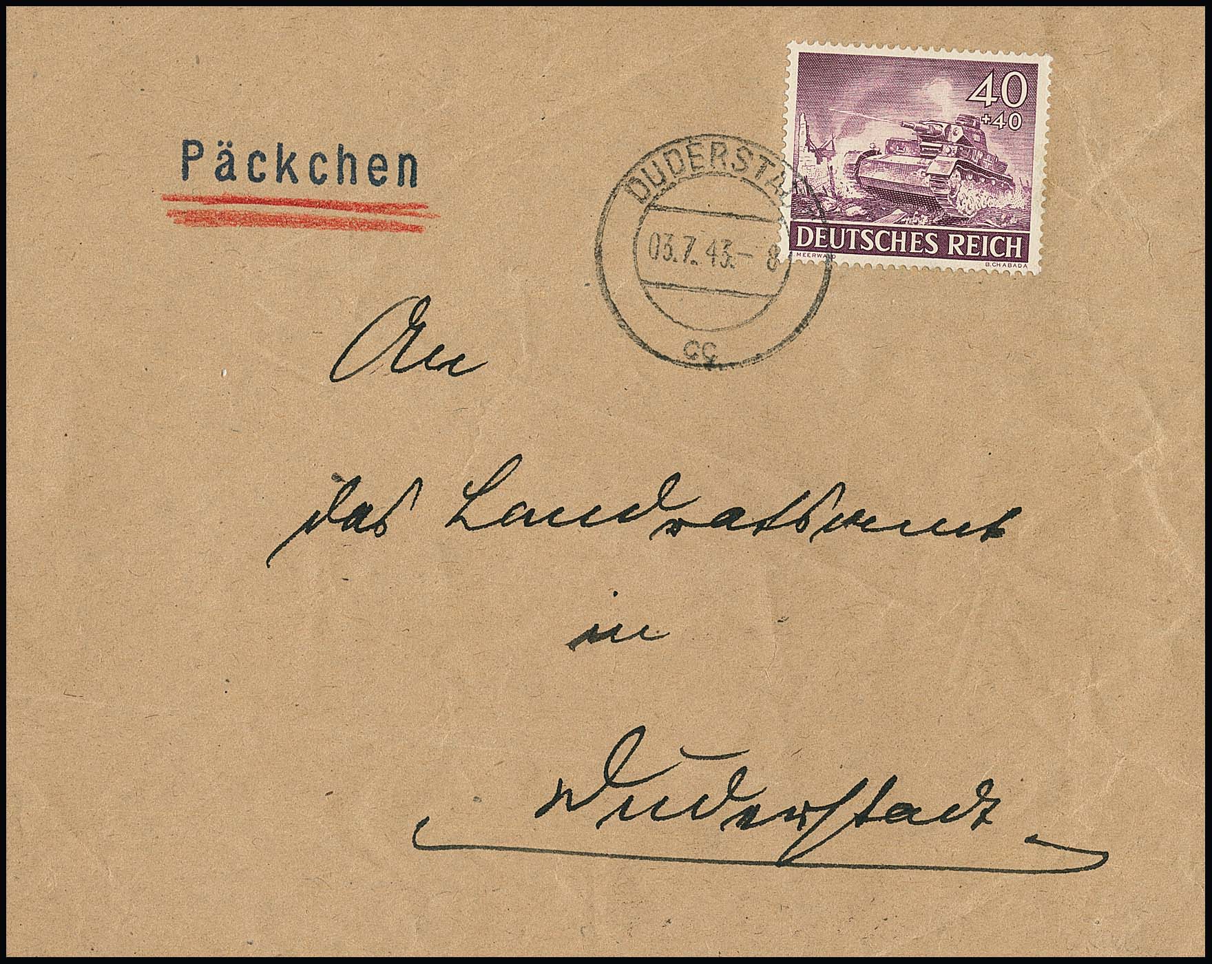 40 + 40 Pfg. Wehrmacht I als gute Einzelfrankatur auf Orts-Päckchen-Adresse aus Duderstadt 1943