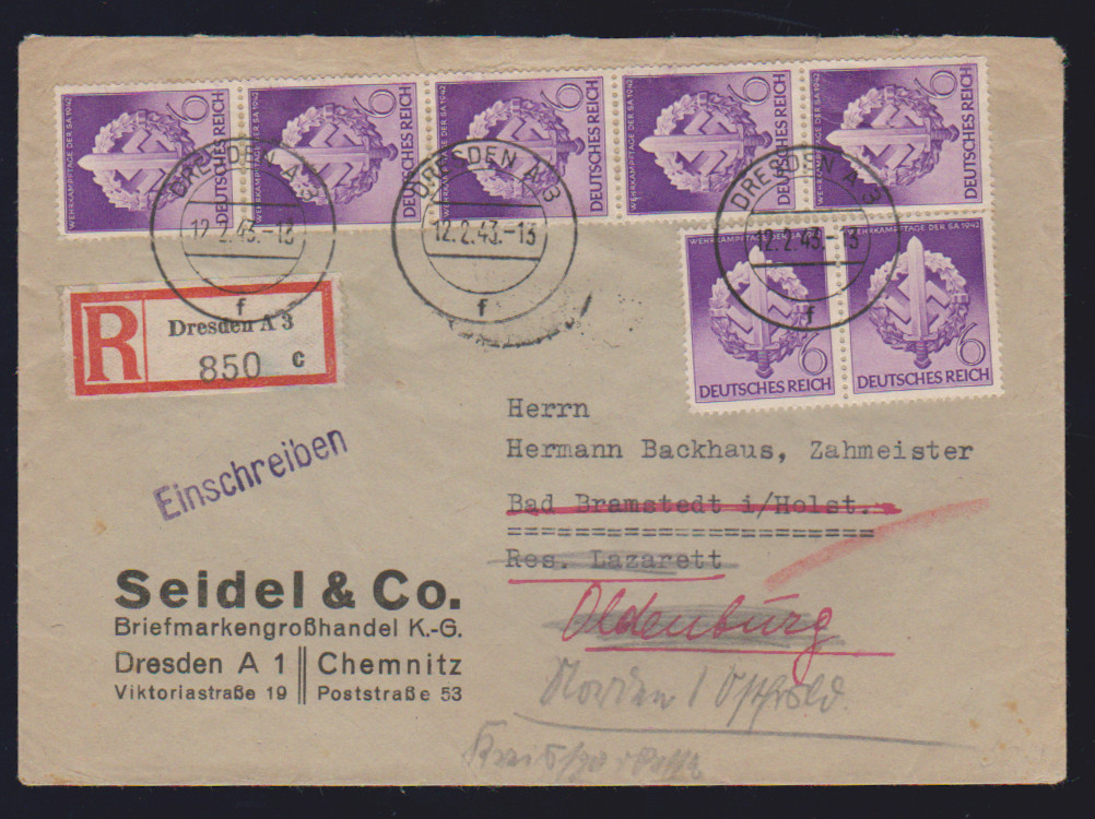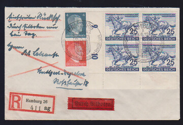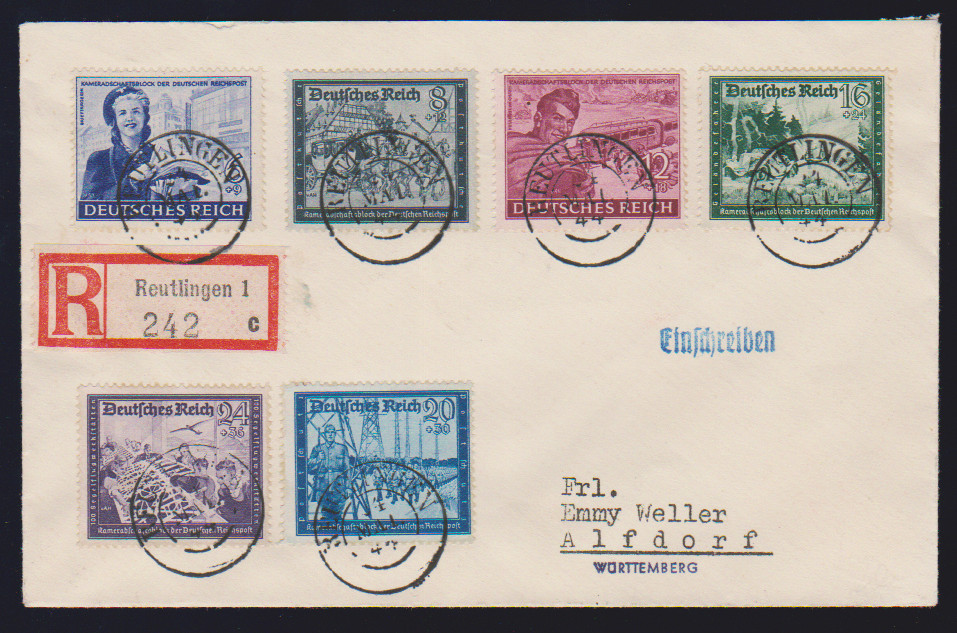 Drei bessere Belege: Nr. 814 im Eckrand-VB, nebst Zus.-Dr. 4 u. 8 Pfg. Hitler (S278) auf Eil-R-Brief gg. Rsch., ferner Nr. 817 per sieben als MeF auf Nachsendebrief, sowie Nr. 888-93 auf Satz-R-Brief (mit altem Württemberg-K2 "Reutlingen")