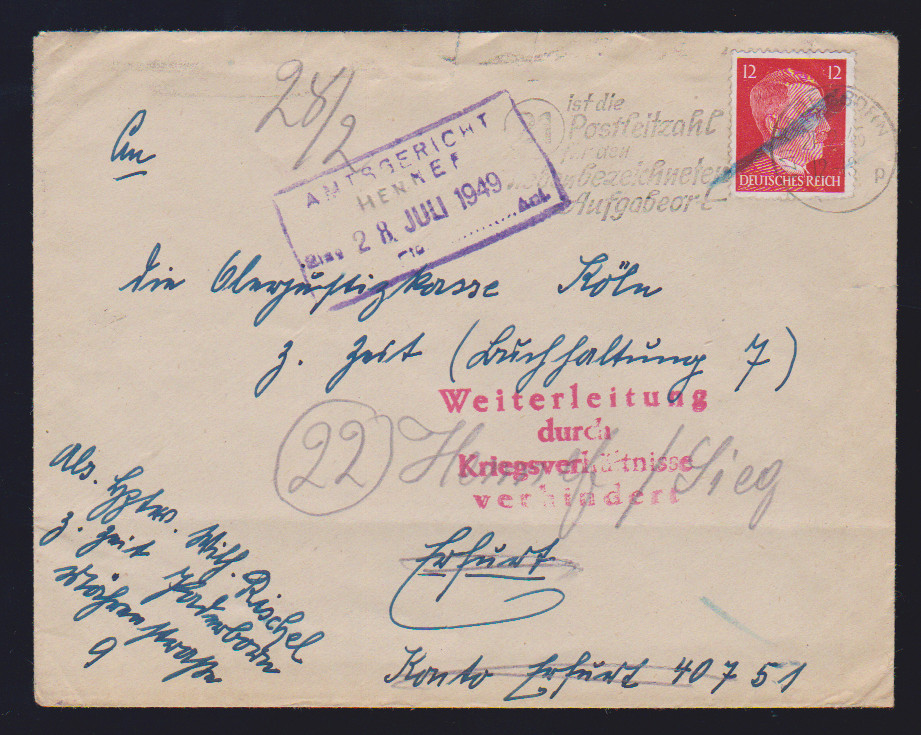 12 Pfg. Hitler auf spätem Brief aus Paderborn nach Erfurt, 21.2.45, L3 "Weiterleitung durch Kriegsverhältnisse verhindert" und schließlich am 28 Juli 1949 (!) in Hennef zugestellt