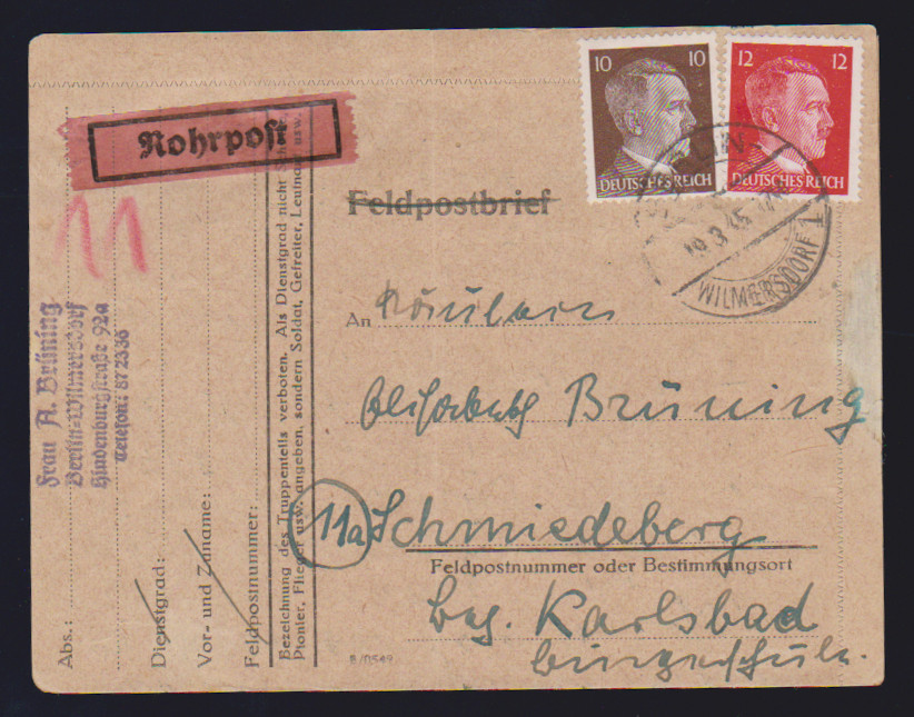 10 u. 12 Pfg. Hitler auf Rohrpostbrief ab Berlin, sehr spät 19.3.45, nach Karlsbad/Böhmen