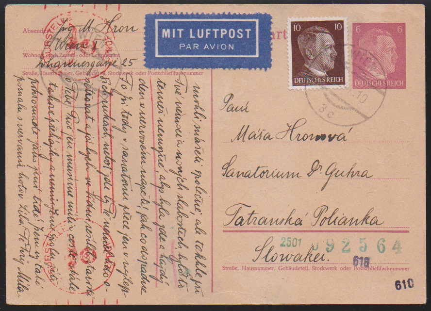 10 Pfg. Hitler auf portoger. Lupo-Zensur-Auslands-Ganzsachenkarte 6 Pfg. von Wien 1944 in die Slowakei (Riemer G-26a, 1000 Punkte)